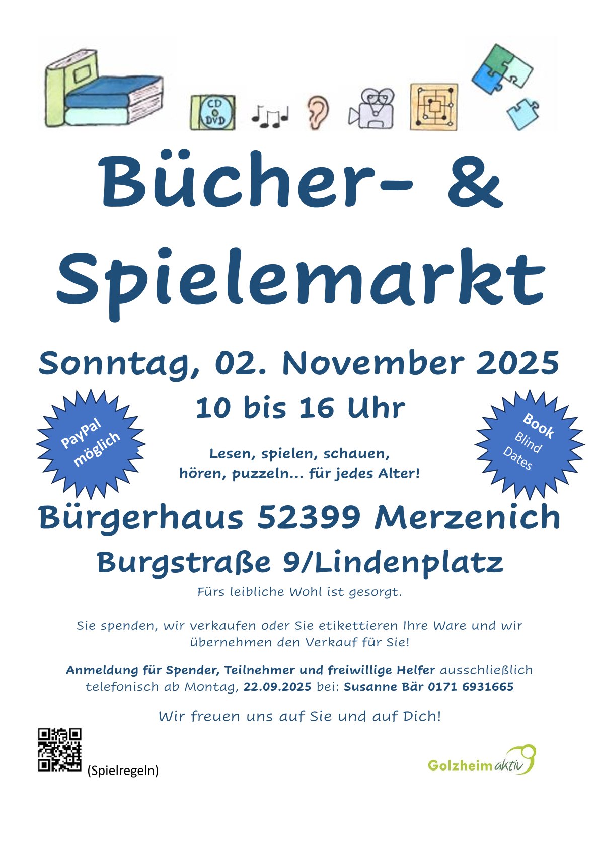 Am 02. November findet wieder der beliebte Bücher- und Spielemarkt im Bürgerhaus in Merzenich statt.